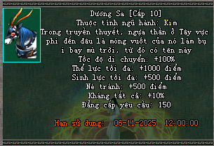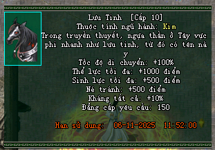1 Bộ Định Quốc (ngẫu nhiên thuộc tính) 1 Chiến Mã Lưu Tinh (30 ngày) 1 Mặt Nạ (30 ngày) 1 Huyền Tinh cấp 7 (khóa) 1 Huyền Tinh cấp 5 (khóa) 1500 Tiền đồng 1 Vòng sáng hào quang (30 ngày) |